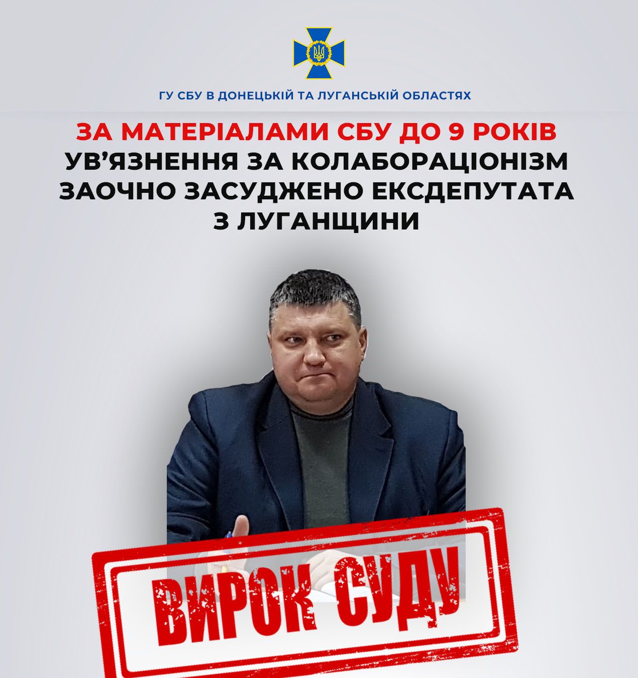 Колишного начальника відділу освіти Новоайдарської селищної ради, депутата Щастинської районної ради восьмого скликання заочно засуджено до дев’яти років в’язниці за колабораціонізм. Про це повідомляється на Facebook-сторінці ГУ СБУ в Донецькій та Луганській областях.