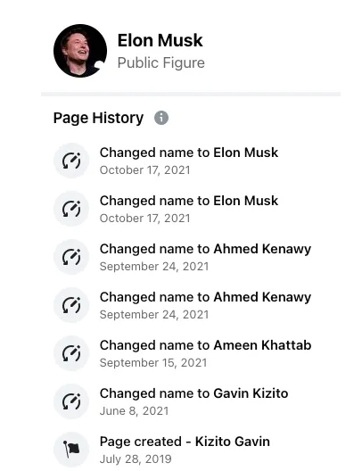 З інформації у вкладці “Прозорість сторінки” стає відомо, що вона існує з липня 2019 року і спершу називалася “Kizito Gavin”. Це прізвище та ім’я футболіста з Уганди Гевіна Кізіто. Потім назву сторінки кілька разів змінили в поточному році. При тому два рази на “Elon Musk”.