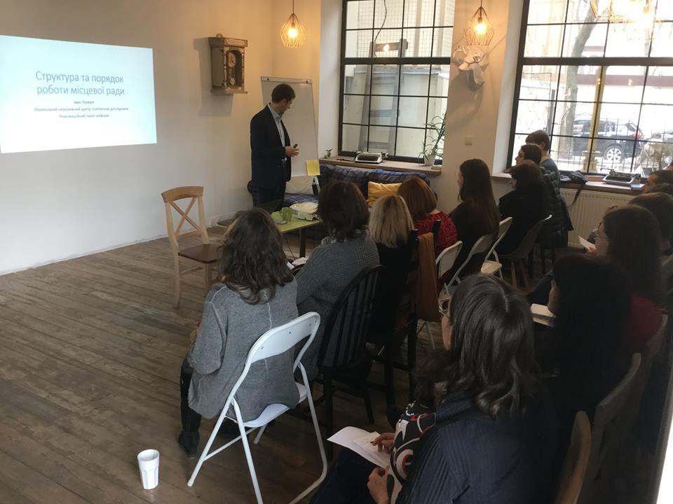 Розпочали навчання з того, якою є структура органів місцевого самоврядування та процедура прийняття рішень. Експерт Українського незалежного центру політичних досліджень Іван Лукеря розповів, які закони резулюють діяльність місцевої влади, чинну система органів публічної влади на місцях, чим відрізняються повноваження міського голови і депутатів, права і обов’язки секретаря міської ради та виконавчого комітету та інше.