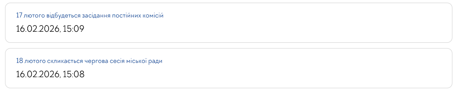 Так, інформація про проведення 60 чергової сесії, яка відбулася 18 лютого 2026 року, на сайті міськради опублікована 16 лютого. За день також було повідомлено про проведення спільних засідань депутатських комісій, які відбулися 17 лютого.