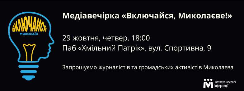 Запрошуємо миколаївських журналістів та громадських активістів, які займаються місцевою тематикою, на медіавечірку “Включайся, Миколаєве!”, організовану Інститутом масової інформації. Участь візьмуть виконавча директорка ІМІ Оксана Романюк, медіа-експерти ІМІ, журналіст hromadske.tv Богдан Кутєпов.