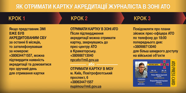 На картці також є номери телефонів прес-офісів АТО у Краматорську та Міністерства оборони в Києві. “Це робиться заради безпеки самих журналістів, щоб запобігти попаданню під обстріл під час роботи”, – додав в.о. керівника прес-служби Генштабу України.