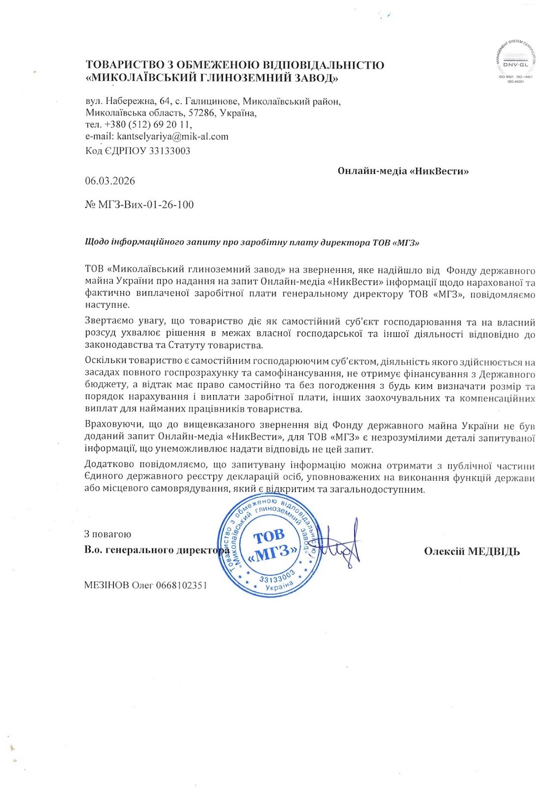 “Враховуючи, що до вищевказаного звернення від Фонду державного майна України не був доданий запит онлайн-медіа “МикВісті”, для ТОВ “МГЗ” є незрозумілими деталі запитуваної інформації, що унеможливлює надати відповідь не цей запит”, – йдеться у відповіді на запит за підписом директора Олексія Медвідя.