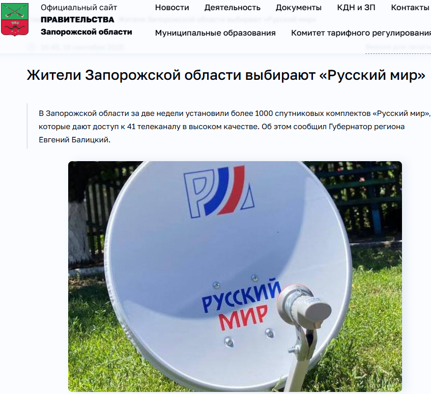 У вересні 2025 року окупаційний голова частини Запорізької області Євген Балицький своїм наказом заборонив жителям ТОТ області використовувати українські комплекси супутникового мовлення “Горинич” і зобов’язав демонтувати їх до 1 жовтня 2025 року. Замість них почали встановлювати супутникові антени “Рускій мір”, які транслюють російську пропаганду і дезінформацію.