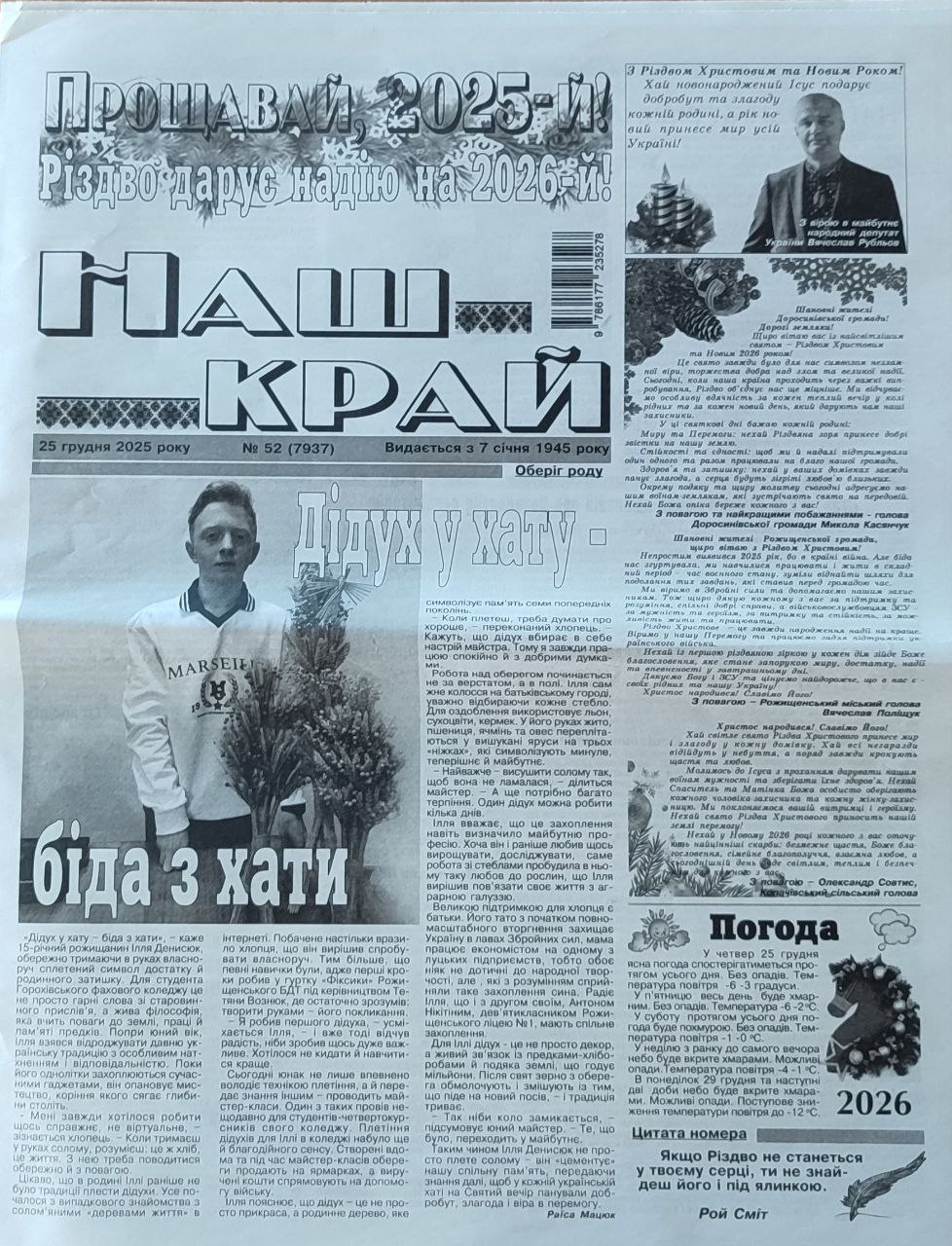 Газета “Наш край” виходить із 7 січня 1945 року. Останній номер видання було надруковано 25 грудня 2025 року.