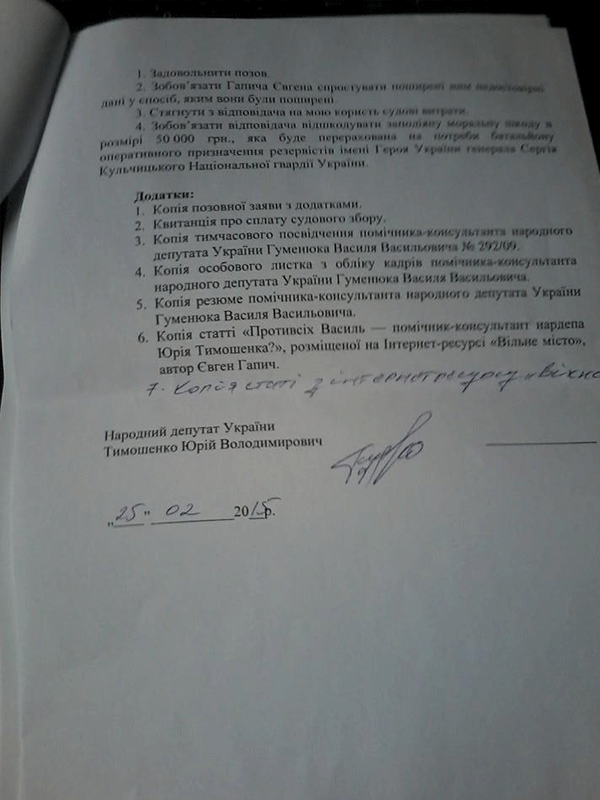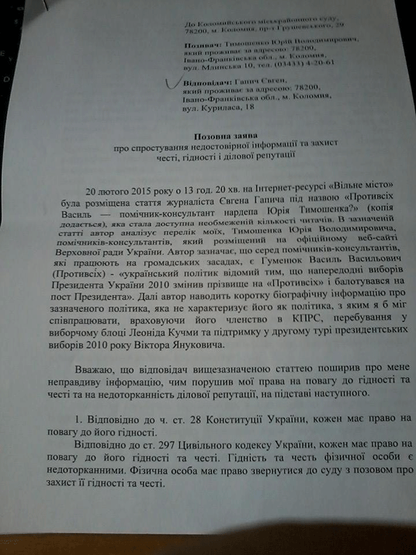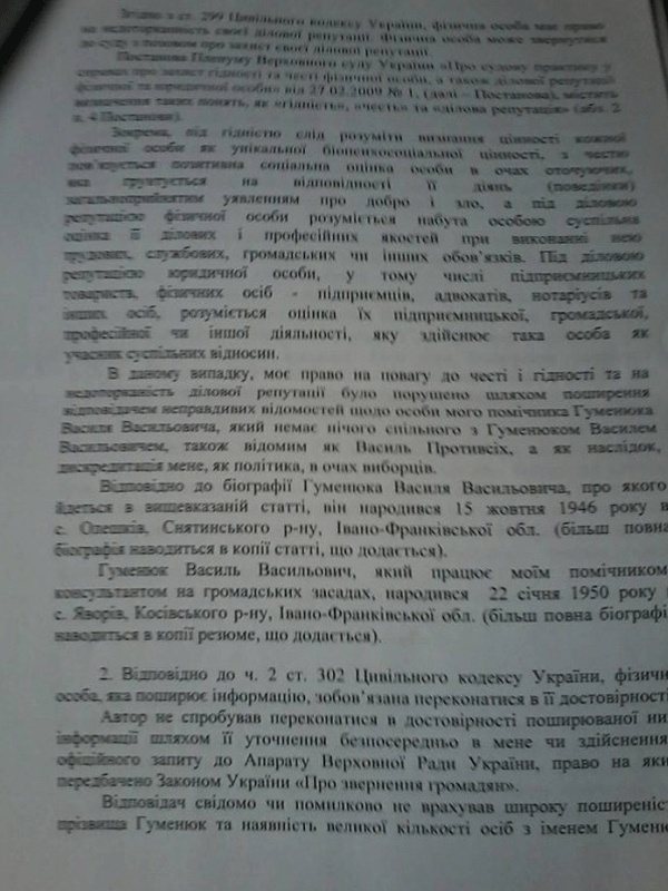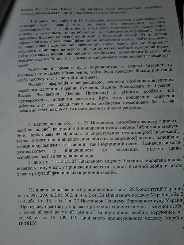 У позовній заяві Юрія Тимошенка зазначено: “Вказана інформація є неправдивою, оскільки помічник-консультант народного депутата України Гуменюк Василь Васильович та Гуменюк Василь Васильович (Василь Противсіх) є різними особами, що підтверджується доданими доказами. Крім того, поширення зазначеної інформації завдає шкоди таким моїм особистим немайновим благам, як повага до честі та гідності та недоторканість ділової репутації”, – йдеться у позовній заяві Юрія Тимошенка.