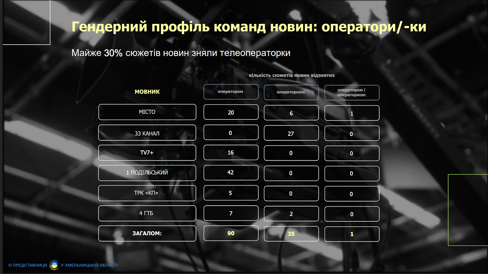 Національна рада з питань телебачення і радіомовлення наприкінці листопада 2025 року зафіксувала гендерно нейтральний характер контенту в теленовинах Хмельниччини. Зокрема, над новинами одного телеканалу працюють лише жінки, а 30% сюжетів на шести телеканалах у цей період зняли жінки-операторки.