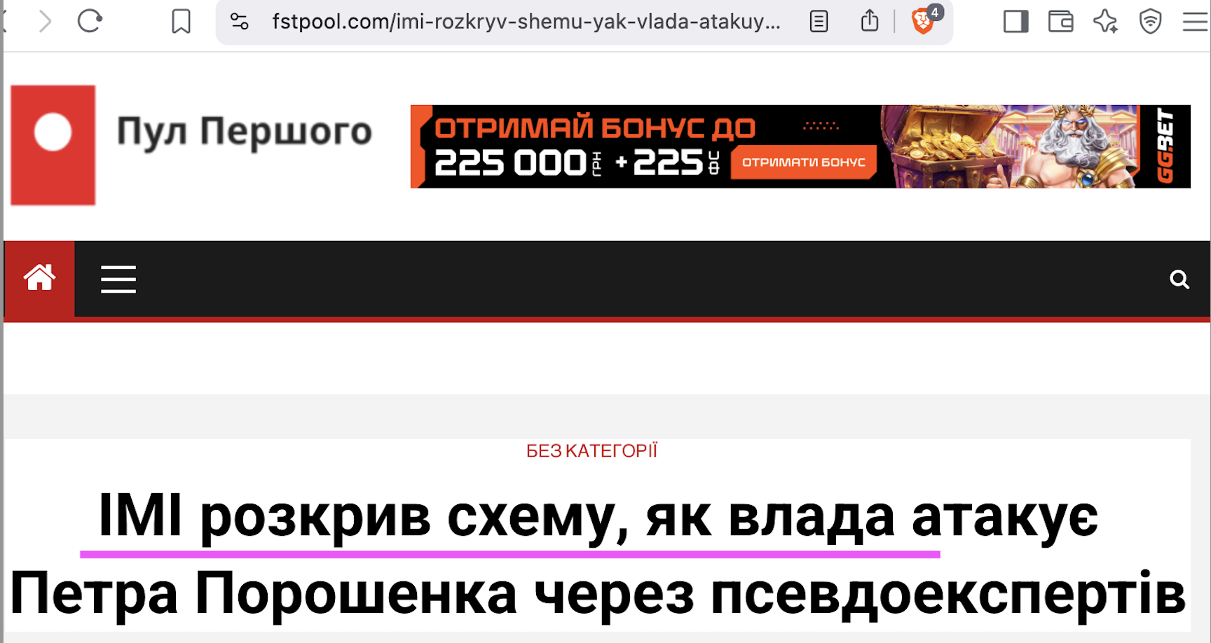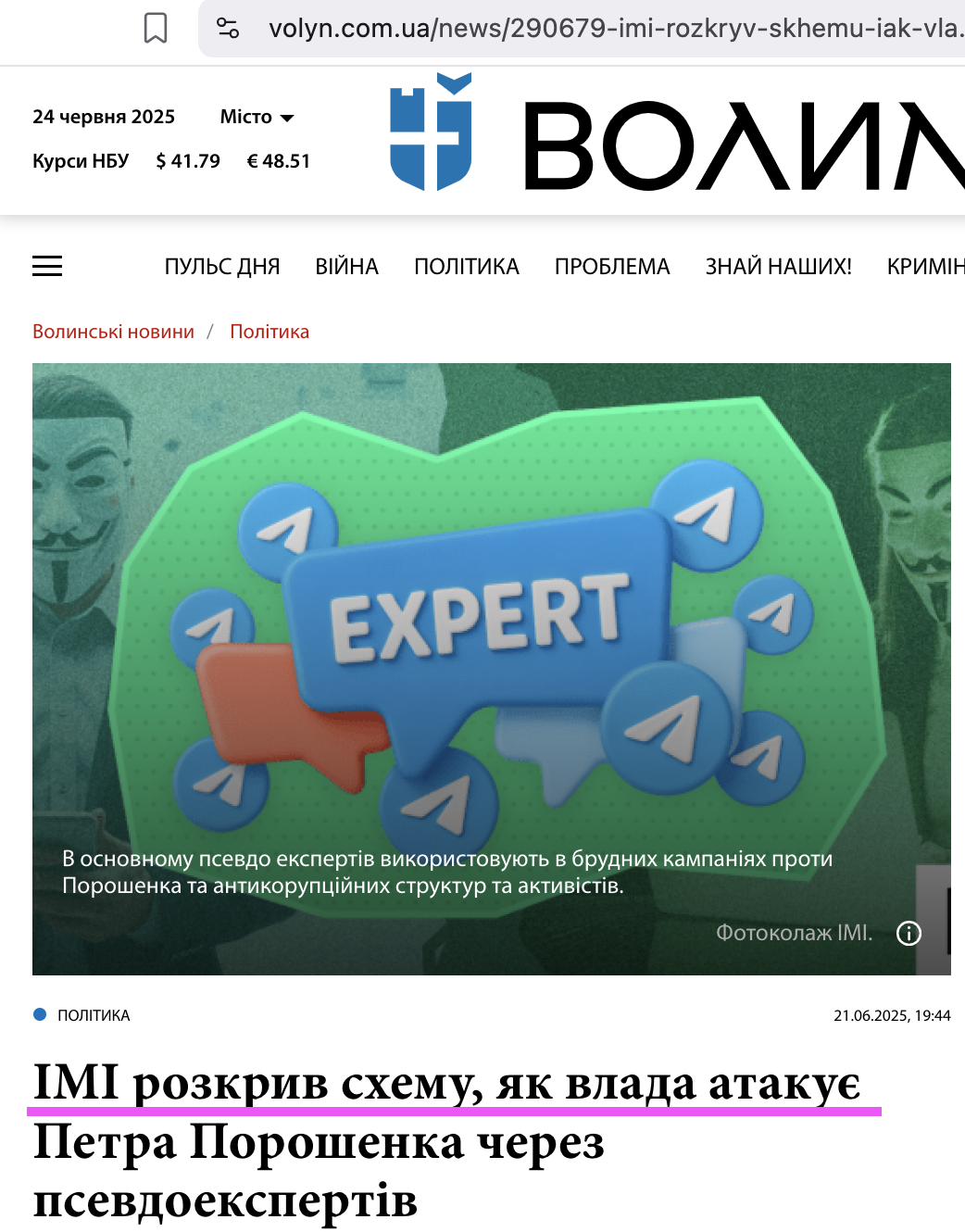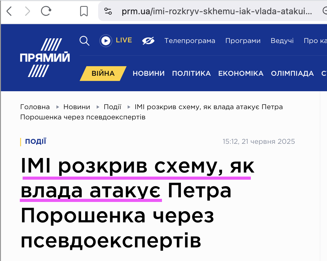 Тема дослідження стосувалася розміщення та використання “експертних коментарів” в анонімних телеграм-каналах, де експерти, окрім коментування різних тем, також висловлюють експертизу в темах чорного піару та скандалів. Аналітики ІМІ зафіксували, що в цих телеграм-каналах з мільйонною аудиторією траплялися згадки про Порошенка з коментарями різних експертів, які раніше були помічені в проєктах, що обслуговували корпоративні чи приватні конфлікти. Втім, в онлайн-медіа були розміщені матеріали із заголовками та деталями, яких не було в оригінальному дослідженні, про те, що начебто ІМІ назвав, що це влада атакує Порошенка.