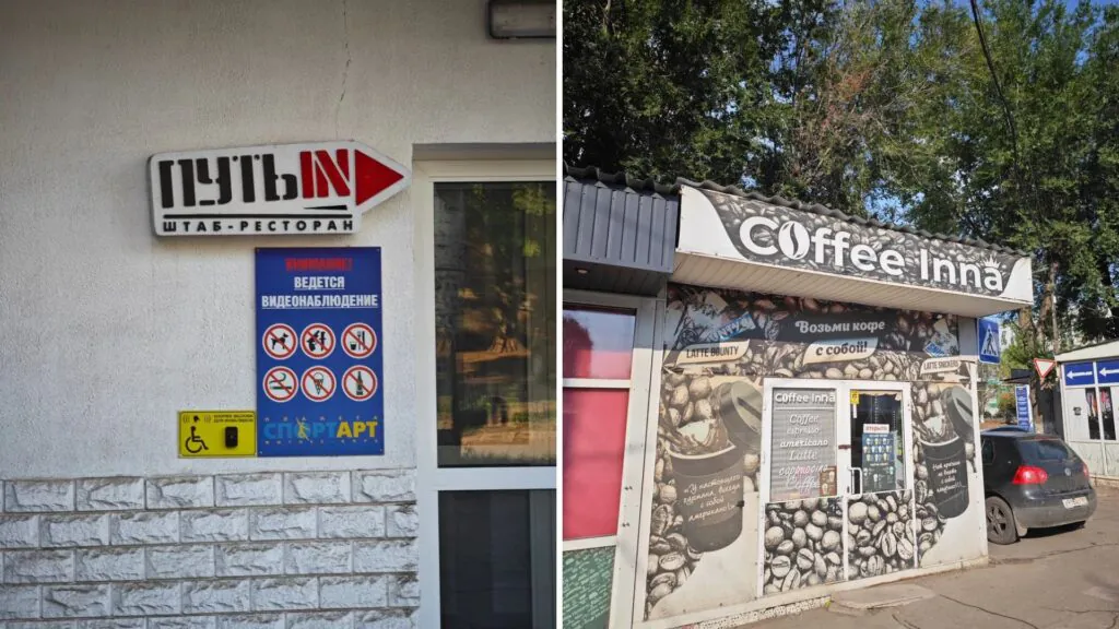 Нормам російського законодавства не відповідає назва ресторану “ПутьIN” та кавʼярні СoffeInna, де звичні назви напоїв – espresso, americano, latte – написано англійською.