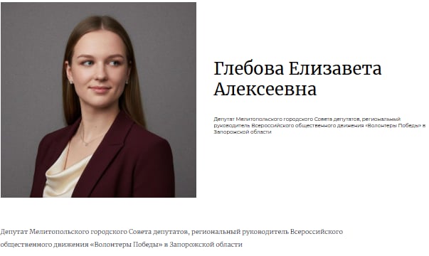 За інформацією сайту “Волонтери Перемоги”, регіональною координаторкою діяльності в Запорізькій області є Єлізавета Глєбова. Вона місцева колаборантка, також є депутаткою окупаційної міської ради депутатів від “Єдиної Росії”.
