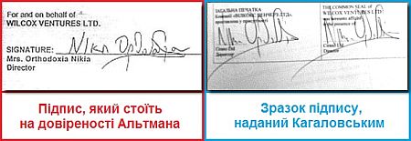 У свою чергу Кагаловський надав "УП" зразок підпису Нікії під іншими документами, який містить суттєві розбіжності з підписом на довіреності Альтмана.