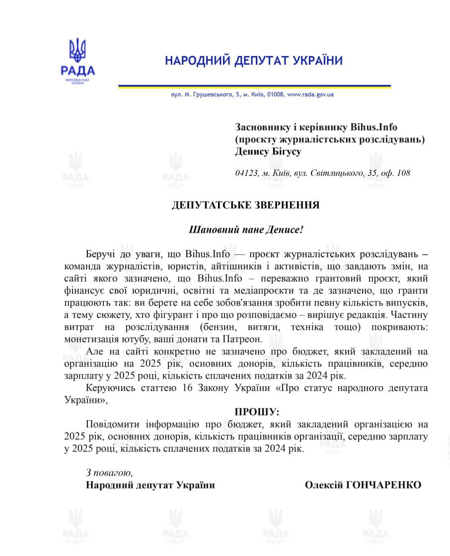 Народний депутат від партії “Європейська солідарність” Олексій Гончаренко після виходу про нього розслідування Bihus.Info звернувся до редакції проєкту, щоб та надала йому відповіді про бюджет медіа, його донорів та заробітну платню співробітників.