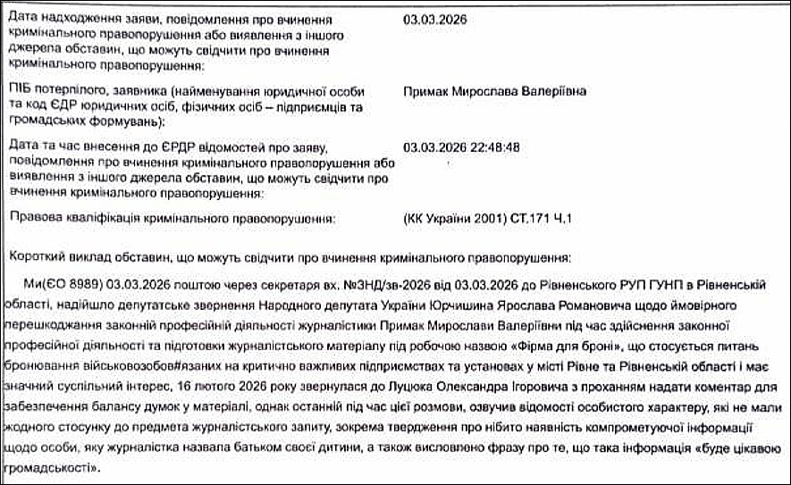 Дані витягу з Єдиного реєстру досудових розслідувань, які “Четверта влада” отримала від Мирослави Примак