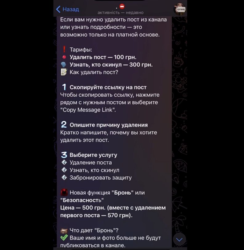 За її словами, адміністратори груп надсилали повідомлення з переліком вартості послуг за видалення образливого контенту. Публікації видаляли лише після переказу грошей на банківські картку та демонстрації скриншоту квитанцій.