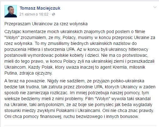 “Сьогодні вранці приїхав на польсько-український кордон в Дорохуську. Прикордонник взяв мій паспорт, перевірив у комп'ютері і запитав українською – пан Мацейчук, коли ви були останній раз в Україні? Відповів, що в кінці січня або на початку лютого, вся інформація в паспорті. Ще одне питання. А що ви такого зробили? Які закони порушили? Ось, і тут відразу відповів – ніякі, але якщо я щось порушив, тоді скажіть, будь ласка, що. Відповіді не було. Мене запросили в офіс і сказали, що отримую заборону на в'їзд в Україну на 5 років. Заборона від СБУ. Значить є загрозою для безпеки України”, – повідомив польський журналіст.