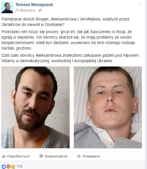 Від ІМІ: Томаш Мацейцук останній рік своєї діяльності займався радше пропагандою на користь сепаратистських утворень на Сході України, його дописи носили характер відверто заангажований.