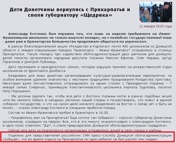 “Окремо для представників російських ЗМІ прес-служба Донецької облдержадміністрації повідомляє, що під час відпочинку на Прикарпатті жодна дитина не була розіп’ята чи з'їдена”, – зазначили в прес-службі.