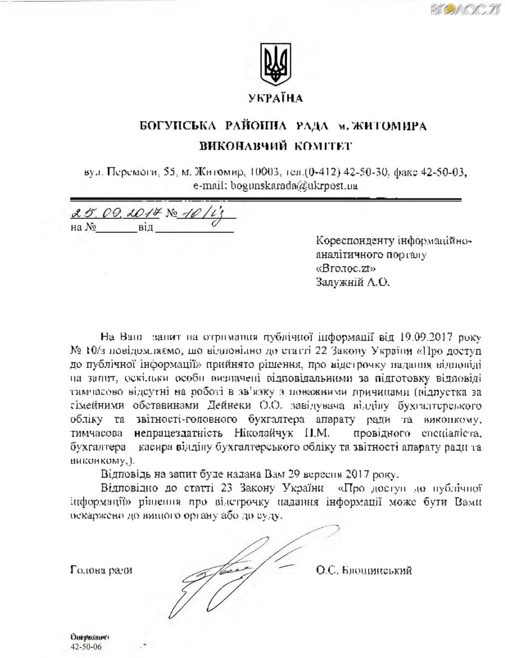 Відповідь надійшла на електронну адресу редакції 25 вересня. У ній голова Богунської районної ради повідомив, що “відповідно до статті 22 Закону України “Про доступ до публічної інформації” прийнято рішення про відстрочку надання відповіді на запит, оскільки особи, визначені відповідальними за підготовку відповіді, тимчасово відсутні на роботі в зв’язку з поважними причинами”.