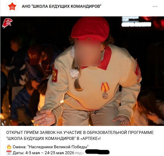 Відбір на програму “Нащадки великої перемоги”, яка діє на території РФ і окупованих територіях України, почався на початку лютого і завершиться в березні. Навчання майбутніх “командирів” відбуватиметься на базі дитячого табору “Артек”. Інформацію про проєкт осередок поширює через заборонену в Україні мережу “ВКонтактє” і в телеграм-каналах.