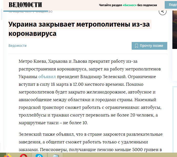 Відповідну новину видання розмістило на своєму сайті 16 березня під назвою “Україна закриває метрополітени через коронавірус”.