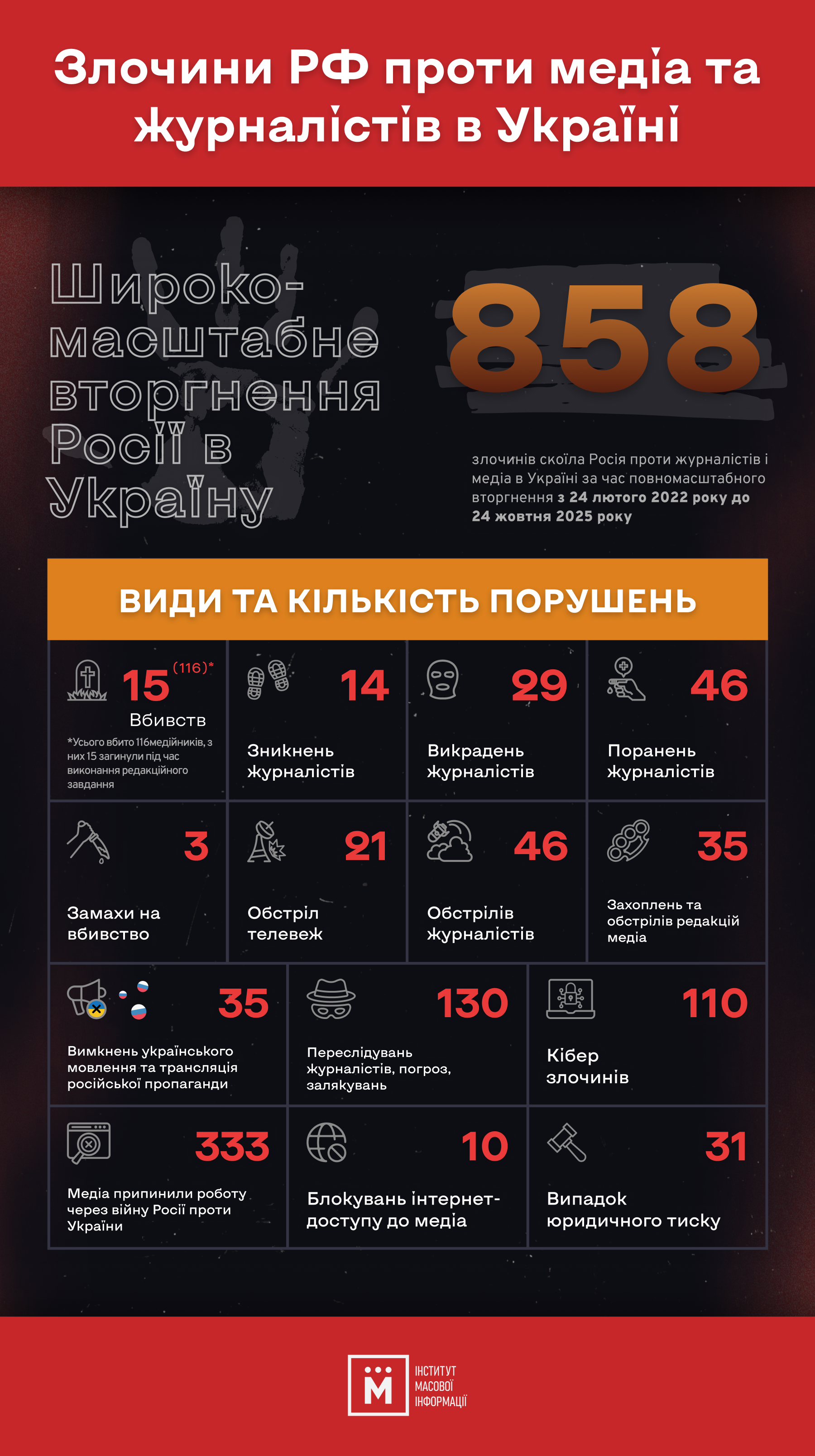 За вересень – жовтень ІМІ зафіксував 10 злочинів проти медіа та журналістів, які скоїла Росія. Це випадки вбивства та поранення журналістів, пошкодження офісів медіа та кіберзлочини.