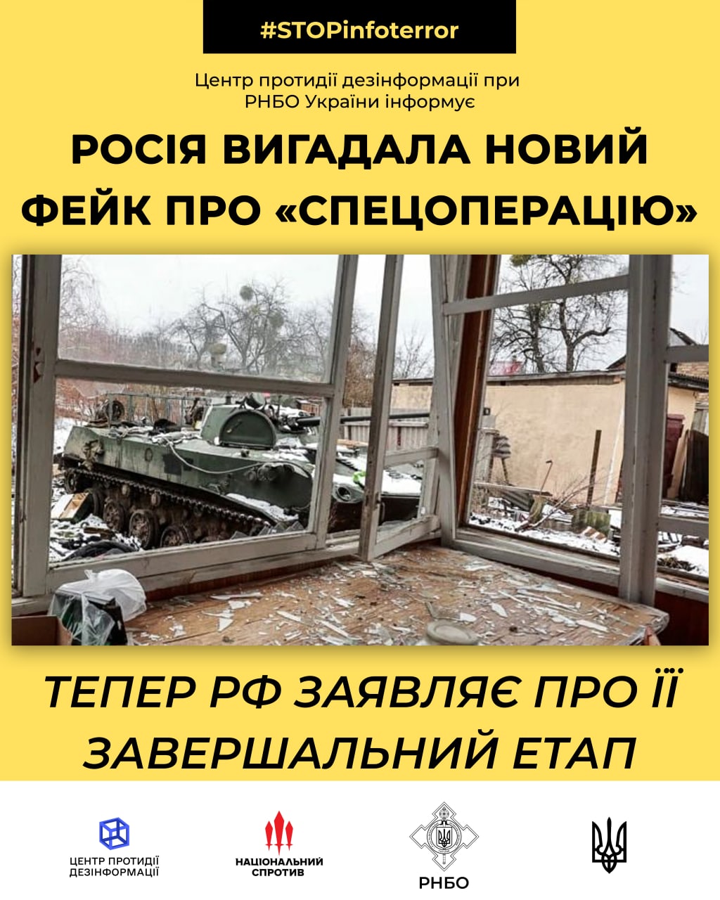 У своєму повідомлені ЦПД повідомляє, що на тлі часткового “виведення” російських підрозділів з території Київської та Чернігівської областей ворог поширює інформацію про те, що начебто найближчим часом “спеціальна операція” на території України буде завершена, бо росія та Україна досягнуть домовленостей. Насправді це ФЕЙК.