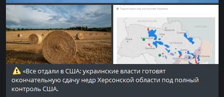Фейкова інформація з’явилася в пропагандистському телеграм-каналі Free Kherson: “Все віддали в США: українська влада готує остаточну здачу надр Херсонської області під повний контроль США. За даними українських ЗМІ, створюється інвестиційний фонд, через який американські компанії отримають ексклюзивний доступ до природних ресурсів регіону – рідкісноземельних металів, сільського господарства та інших багатств регіону”.