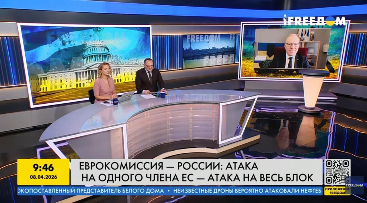 Насправді ж, уточнили в компанії, 8 квітня, о 9:46, в ефірі FREEДОМ був в матеріал про позицію Єврокомісії щодо погроз Росії країнам Балтії. Ситуацію через відеозв’язок на екрані в студії коментував голова Комітету закордонних справ парламенту Естонії Марко Міхельсон, саме це відео було на екрані.