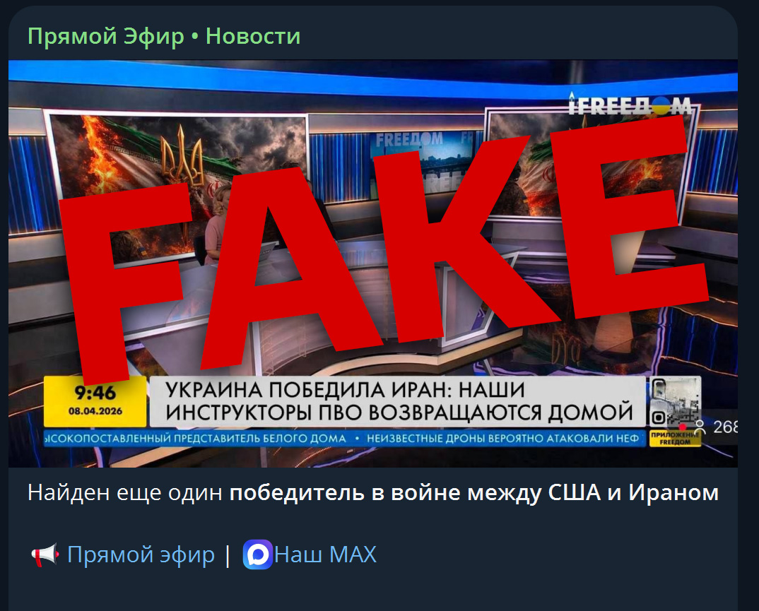 За даними телеканалу, 8 квітня російські телеграм-канали поширили фейкове повідомлення такого змісту, а для ілюстрації використали зображення кадру з ефіру FREEДОМ. На ньому пропагандисти розмістили фейковий текст титру: “Украина победила Иран. Наши инструкторы ПВО возвращаются домой” (укр. “Україна перемогла Іран. Наші інструктори ППО повертаються додому”). Також замінили зображення на екранах у студії FREEДОМ.