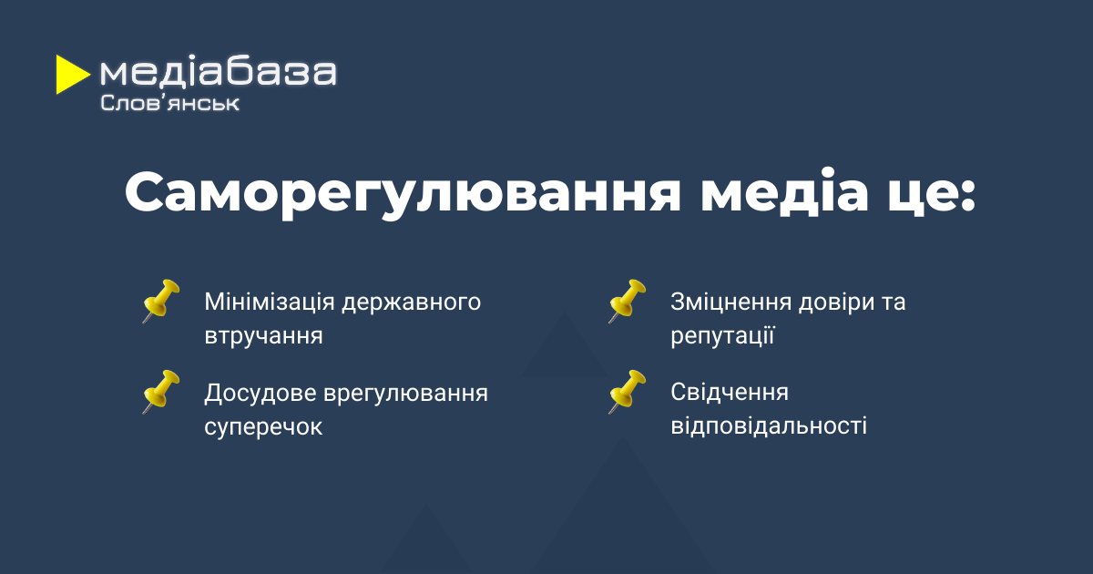 - Мінімізація державного втручання. Добровільне дотримання етики є альтернативою державному регулюванню, дозволяючи зберігати редакційну свободу та незалежність.