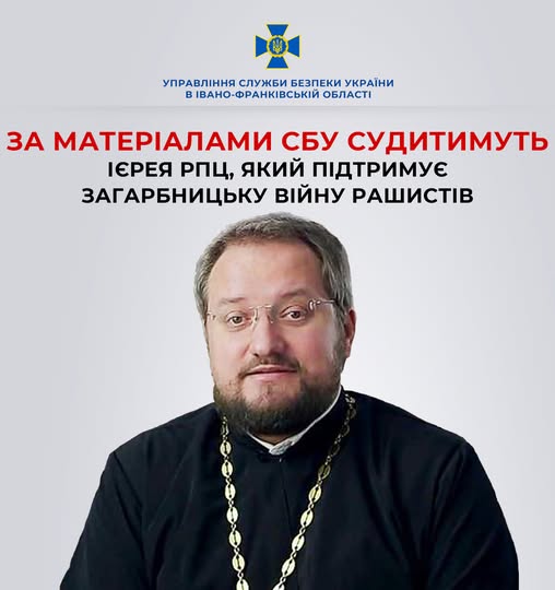 Служба безпеки України передала до суду обвинувальний акт щодо настоятеля Свято-Никольської церкви Пісочинської єпархії РПЦ Калузької області РФ. Про це повідомило Головне управління СБУ в Івано-Франківській області на Facebook-сторінці.