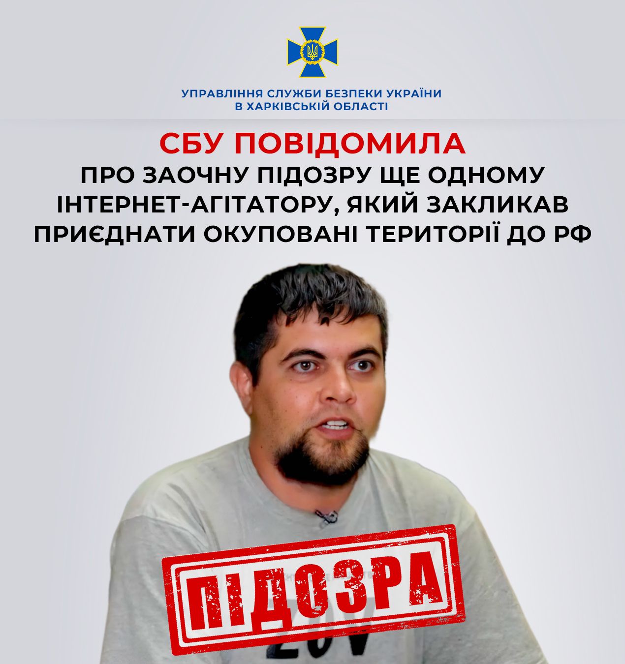 Служба безпеки України (СБУ) повідомила про підозру харків’янину, який закликав до зміни державних кордонів України та виправдовував тимчасову окупацію українських територій. Про це повідомляється на Facebook-сторінці ГУ СБУ в Харківській області.