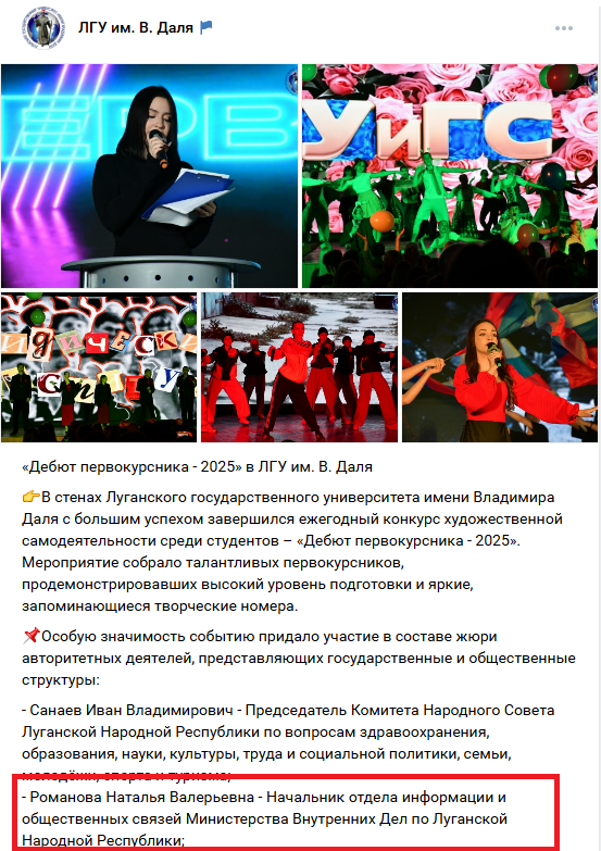 Крім того, на сайті іншого незаконного вишу – “Луганского государственного университета им. В. Даля” – Наталію Романову представлено як доцентку кафедри журналістики. Вона викладає низку дисциплін, зокрема вступ до професії, основи та жанри журналістики, фотожурналістику, інформацію в медіакомунікаціях, еристику та техніку мовлення.