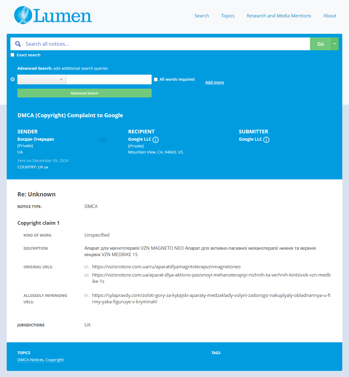 Найпершу скаргу щодо контенту, захищеного авторським правом, редакція отримала 9 грудня 2024 року. Скарга стосувалася розслідування про те, як медичні заклади Волині закупили медичне обладнання для діагностики і реабілітації у фірми з кримінальним шлейфом. У тексті претензії було вказане таке обладнання: “Апарат для магнітотерапії VZN MAGNETO NEO, апарат для активно-пасивної механотерапії нижніх та верхніх кінцівок VZN MEDBIKE 1S”.