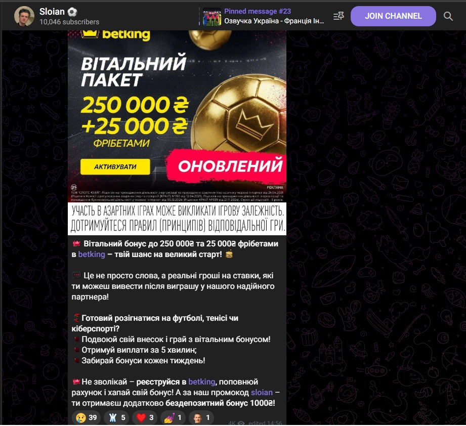 У телеграм-каналі Sloian можна побачити марковану рекламу казино. Скрин Ірини Небесної з телеграм-каналу