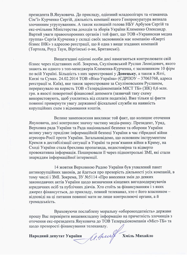 «Руслан Скулімовський, якого знають як одного з топ-менеджерів сім’ї Януковича, є засновником ТОВ «Віка-Україна» (м. Київ), яке перерахувало на користь ТОВ «Телерадіокомпанія МІСТ ТБ» (ТОВ ЗІК) 0,6 млн. грн. в якості поворотної фінансової допомоги, зазвичай таку схему використовують, щоб ухилитись від сплати податків», – вказано у зверненні.