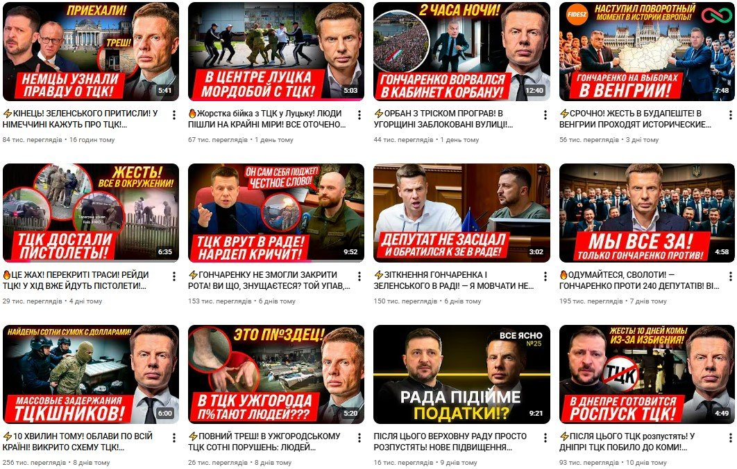 Як зазначається в матеріалі, з 12 останніх відео на ютуб-каналі Гончаренка сім присвячено темі ТЦК і мобілізації. Також автор звертає увагу на емоційні заголовки на кшталт “Це жах! Перекриті траси! Рейди ТЦК! У хід вже йдуть пістолети! Зеленський, де реакція?”.