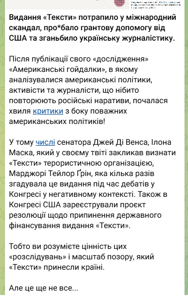 Втім, у чому саме ганьба розслідувань Texty, телеграм-канал не уточнює.