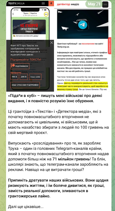 У дописі від 23 травня “Труха” називає Texty та видання “Детектор медіа” (процитувало на своєму сайті дослідження Texty. – Ред.) грантоїдами й закидає те, що нібито ці медіа з початку повномасштабного вторгнення не допомагають ні цивільним, ні військовим, а натомість пропонують підтримати свою діяльність.