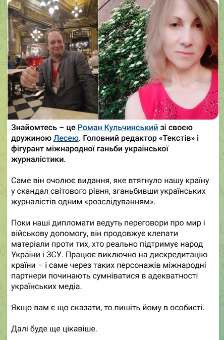 В іншому дописі 28 травня адміністратори телеграм-каналу відзначили сторінки головного редактора Texty Романа Кульчинського та його дружини із закликом писати їм в особисті. Телеграм-канал зазначив, що видання “втягнуло нашу країну у скандал світового рівня, зганьбивши українських журналістів одним “розслідуванням”. Водночас не вказує наслідки розслідування, які нібито призвели до ганьби українських журналістів.