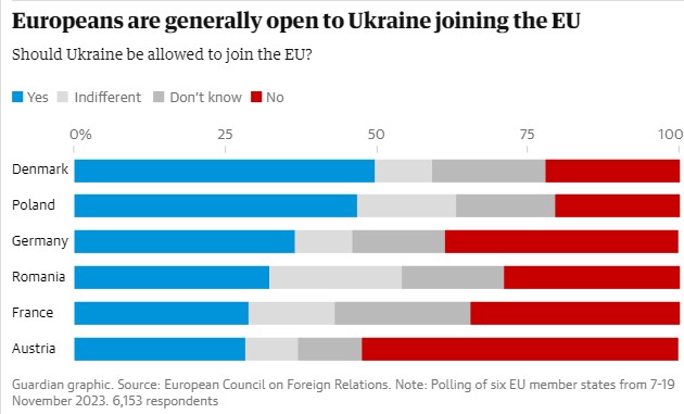 За даними опитування, найвищі показники підтримки вступу України в Данії (50%) і Польщі (47%); думки громадян були розділені в Румунії (32% за, 29% проти), Німеччині (37% за, 39% проти) й Франції (29% за, 35% проти). Австрія проти на 52%.