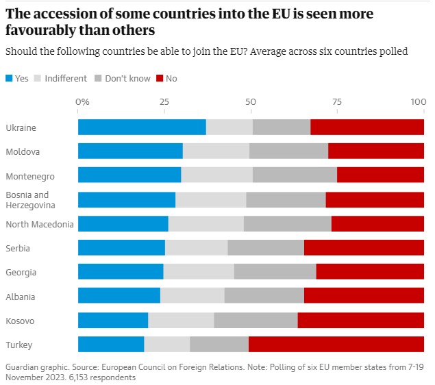 Більшість респондентів була проти потенційного приєднання Туреччини й прохолодно поставилася до перспективи приєднання Албанії, Боснії, Грузії, Косова, Північної Македонії й Сербії.