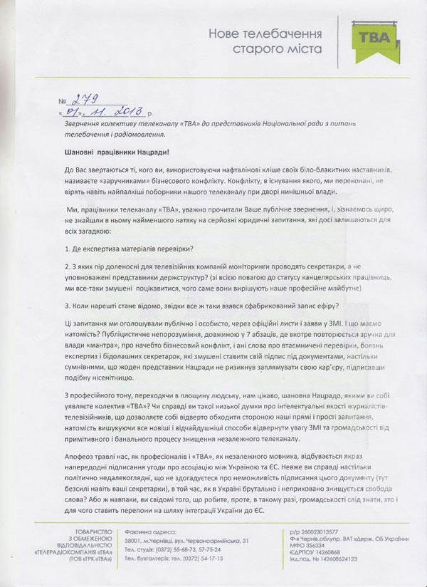 З професійного тону, переходячи в площину людську, нам цікаво, шановна Нацрадо, якими ви собі уявляєте колектив «ТВА»? Чи справді ви такої низької думки про інтелектуальні якості журналістів-телевізійників, що дозволяєте собі відверто обходити стороною наші прямі і прості запитання, натомість вишукуючи все новіші і відчайдушніші способи відвернути увагу ЗМІ та громадськості від примітивного і банального процесу знищення незалежного телеканалу.