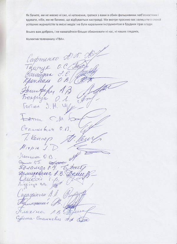 Апофеоз травлі нас, як професіоналів і «ТВА», як незалежного мовника, відбувається якраз напередодні підписання угоди про асоціацію між Україною та ЄС. Невже ви справді настільки політично недалекоглядні, що не здогадуєтеся про неможливість підписання цього документу (тут безсилі навіть ваші секретарки), в той час, як в Україні брутально і неприховано знищується свобода слова? Або ж навпаки, ви свідомі того, що робите, проте, в такому разі, громадськості слід знати, хто і для чого ставить перепони на шляху інтеграції України до ЄС.