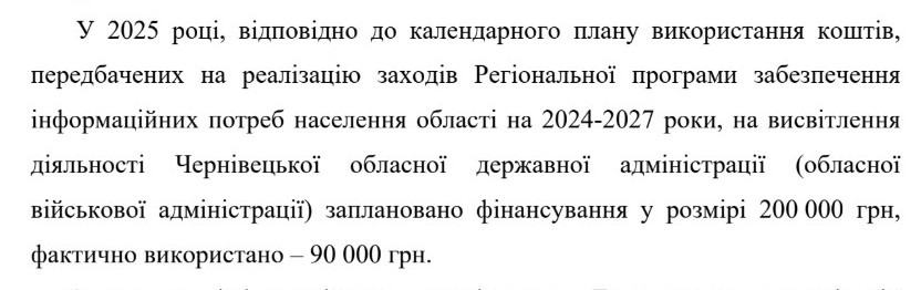 У 2025 році Чернівецька обласна військова адміністрація використала на інформаційне висвітлення своєї діяльності 90 тис. грн. Загалом на комунікацію з медіа планували 200 тис. грн, однак використали тільки 45% запланованого. Про це йдеться у відповіді на інформаційний запит регіональної представниці Інституту масової інформації Альони Чорної.