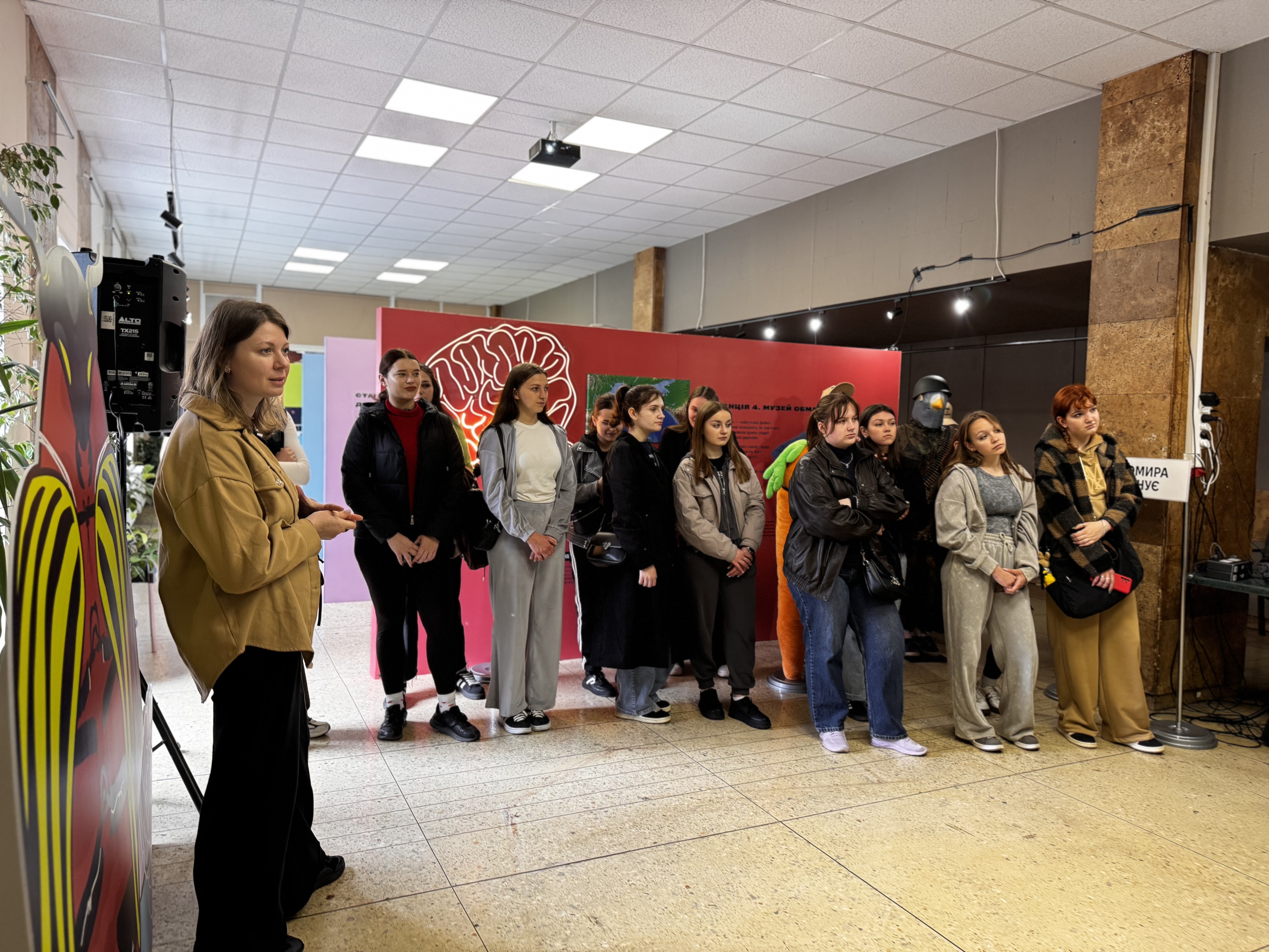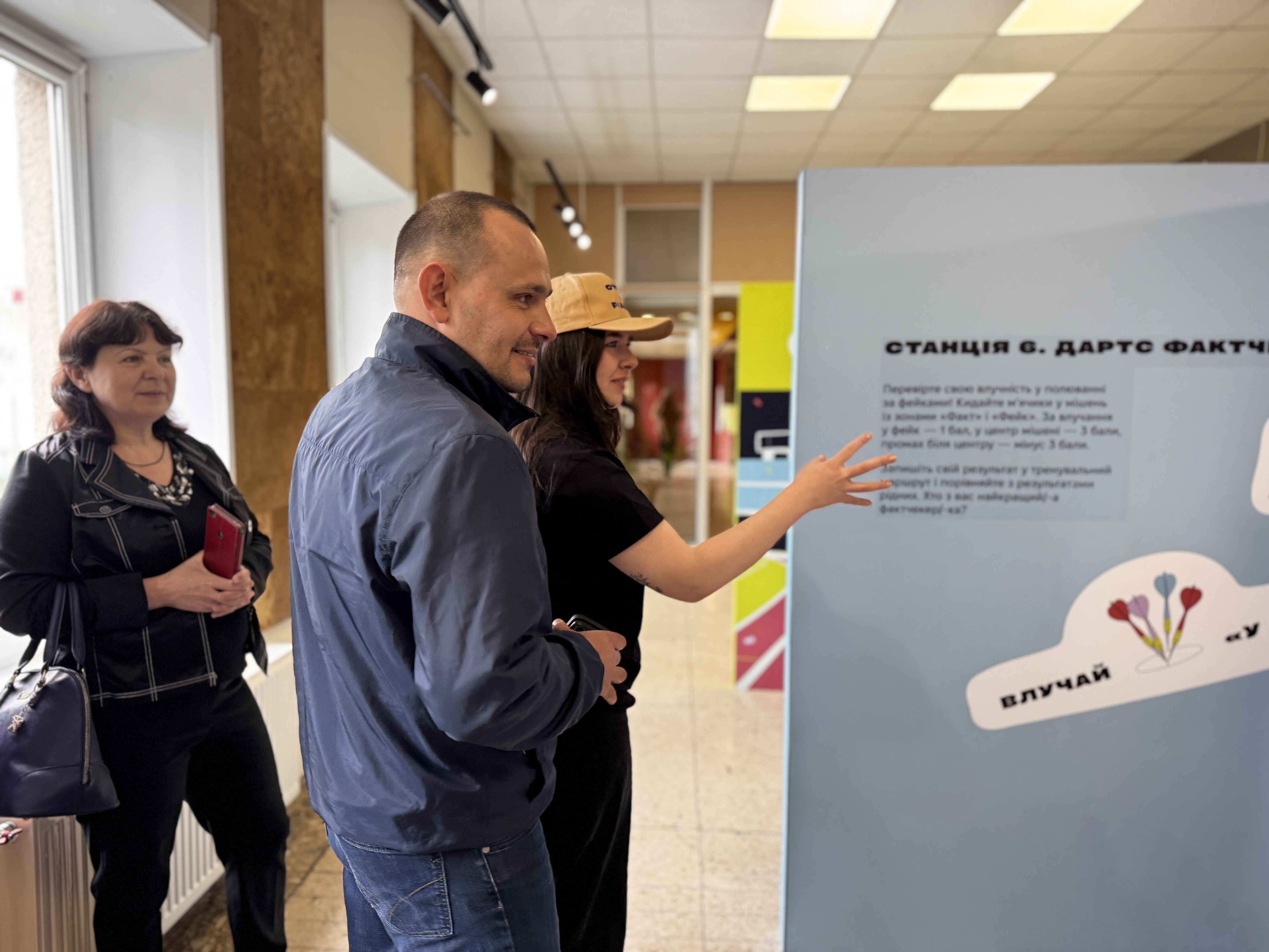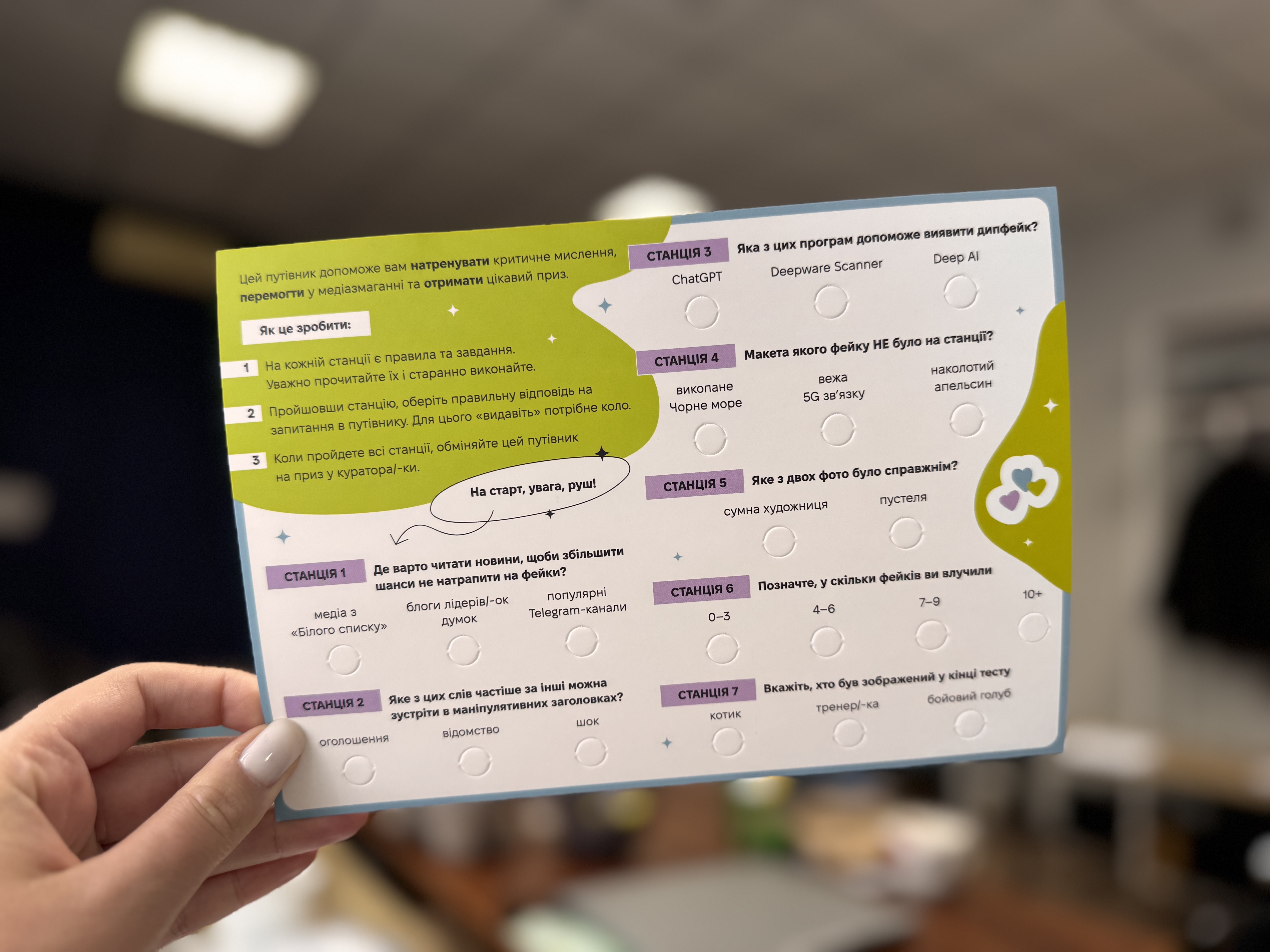 На виставці є сім станцій. Кожна має свою тему: штучний інтелект, маніпулятивні заголовки, дипфейки. На старті кожен учасник отримує путівник, який надалі допоможе йому зорієнтуватися на станціях. Виконуючи завдання, на фініші можна обміняти путівник на подарунок: закладку, стікерпак тощо.