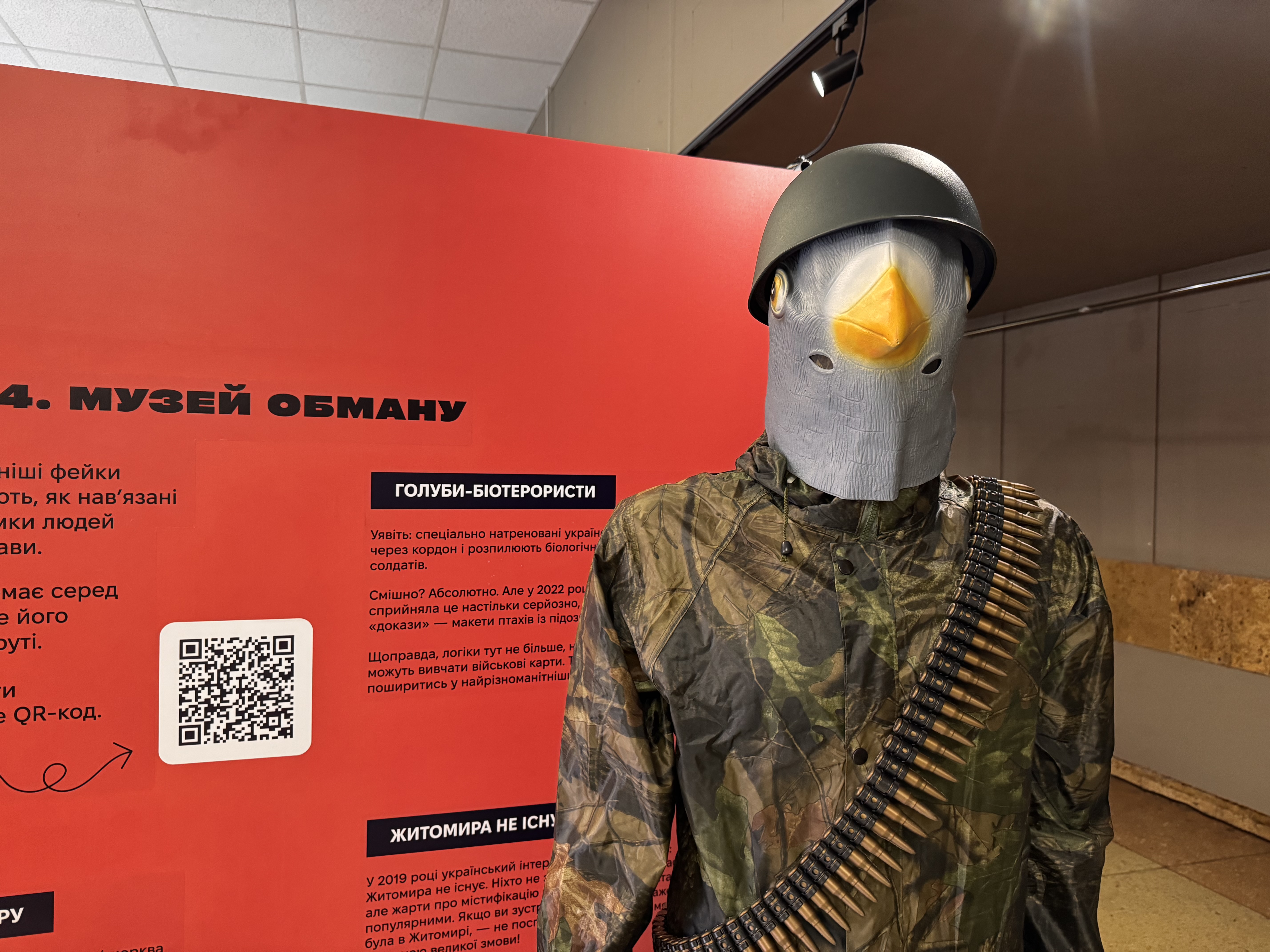 Крім того, на виставці є “музей обману” – історії про найпопулярніші фейки, а також інсталяції. Один з експонатів – голуб розміром з людину як символ фейків про “біологічну зброю” українців, які масово поширювали росіяни на початку повномасштабного вторгнення.