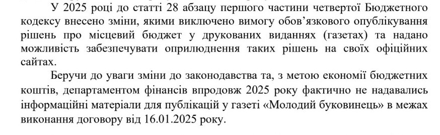 Так, департамент фінансів передбачив 10,4 тис. грн на публікацію рішення про бюджет громади на 2026 рік та 16 січня 2025 року уклав договір з ТОВ “Редакція газети “Молодий буковинець”. Однак після змін до Бюджетного кодексу обов’язкову публікацію бюджетних рішень у друкованих медіа скасували, тому фактично матеріали до газети не подавали.