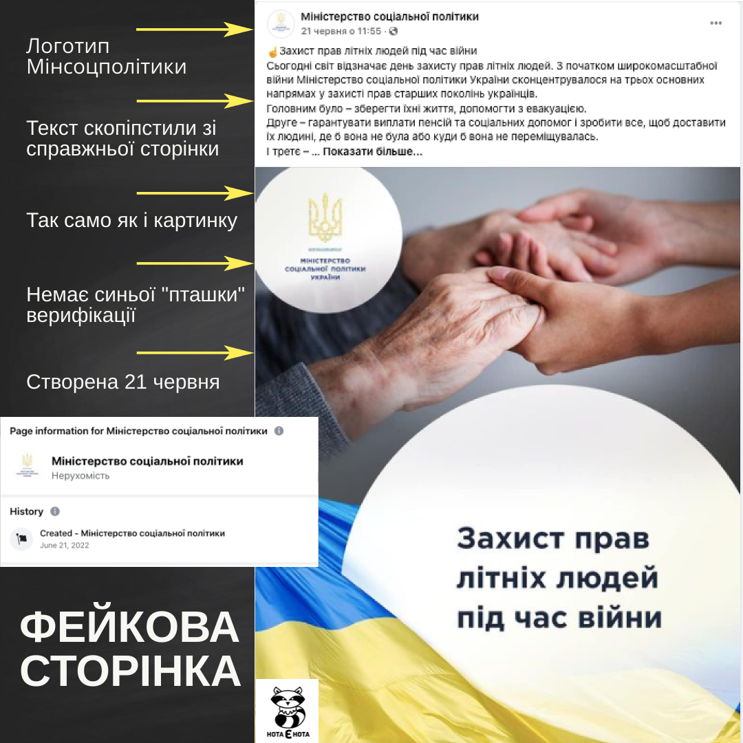 Зазначається, що обидва матеріали скопійовані зі сторінки справжнього Міністерства соціальної політики від 15 та 16 червня. З тими ж зображеннями та розділовими знаками.