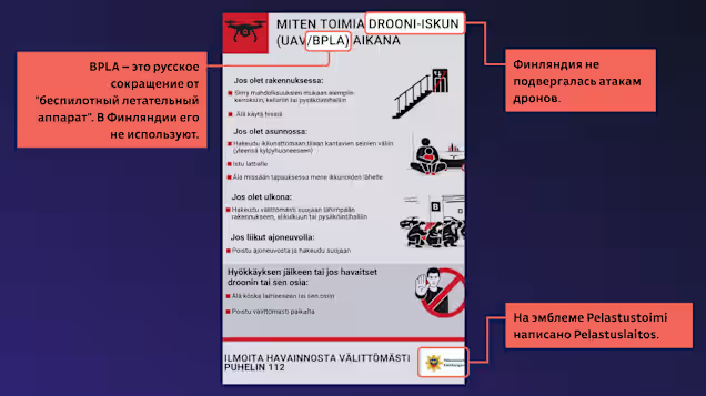 Фальшиві інструкції почали поширюватися після того, як наприкінці березня в Південно-Східній Фінляндії впали три дрони. Як зазначає медіа, фальшивки спочатку з’явилися в російських соцмережах. У них пояснюється, як захиститися від дронів у приміщенні та на вулиці, а також як діяти після атаки. Документ містить логотип рятувальної служби.